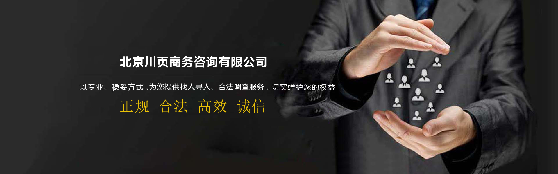 北京市偵探公司-北京川頁商務(wù)咨詢有限公司是面向全國提供找人尋人服務(wù)平臺,公司致力于為企業(yè)、個人解決發(fā)展中各類債務(wù)問題、債權(quán)訴訟、債權(quán)轉(zhuǎn)讓事務(wù),幫助快速尋找親人、朋友、戀人、戰(zhàn)友等找人服務(wù),以及婚姻家庭情感咨詢等業(yè)務(wù)。公司擁有一批律師,商賬管理師專業(yè)的工作人員,依托互聯(lián)網(wǎng)平臺,在國內(nèi)形成了完善的調(diào)查尋人服務(wù)網(wǎng)絡(luò),業(yè)務(wù)范圍已經(jīng)逐漸覆蓋北京及全國各大主要城市和地區(qū)。我們始終秉承"捍衛(wèi)真理、堅持誠信、以人為本、奉獻(xiàn)社會"的服務(wù)理念和"專業(yè)、創(chuàng)新、和諧、共贏"的經(jīng)營理念,我們希望通過提供全面、及時、準(zhǔn)確、專業(yè)的相關(guān)信息,以優(yōu)質(zhì)的服務(wù),專業(yè)的技巧,為各位有需求的人員提供服務(wù)!